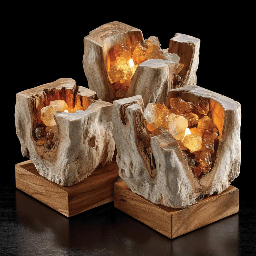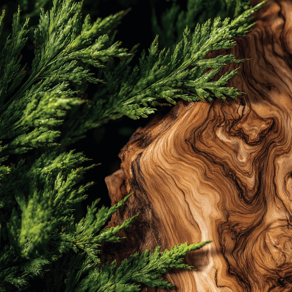 Golden resin glowing against cedar’s dry elegance.